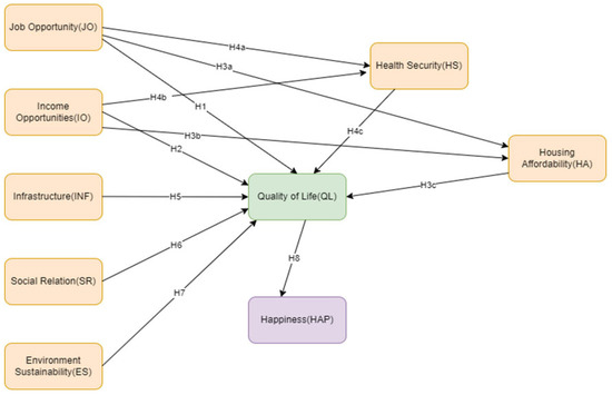 Housing is one of the key indicators of QoL. Objective indicators of QoL are measured through wealth, income, consumption expenditure, condition of housing and its affordability, ownership of consumer durables, etc. Housing indicators reflecting the quality of life could be assessed through its quality, environment and cost indicators. Streimikiene [56] presented the concept of assessing housing as an indicator in the quality of life index. Housing conditions encompass its physical attributes as well as satisfaction level. The major issues considered for household selection depend upon its good condition and cost in many countries [57,58]. Most of the studies emphasized the dimensions of affordability, availability and quality. These aspects together are crucial to measure people’s housing needs. Few studies focused on safety, stability, environmental integrity and accessibility. Housing affordability is measured through the average cost for accessing a house on the basis of income. A quality job with high income plays a dominant role in affording a good quality house in a better locality. Income is considered statistically important in most of the literature on quality of life and well-being [59] as this can open doors for better education, health facilities, housing affordability, etc. The COMLE model [60] prefers the “vitality of housing” as a crucial housing indicator in a community’s economy. ‘Right to adequate housing’ is a human right which means it should be more than four walls and a roof over one’s head. The above discussion leads to the formation of the following hypothesis: