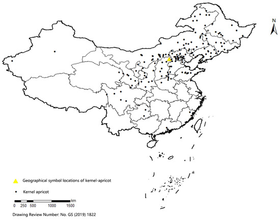 The Chinese apricot kernel industry exhibits a distributed pattern characterized by three relatively concentrated scale production areas, the east, center, and west. These regions encompass a total area of approximately 2.666 million hectares, with a combined annual almond production of about 20 tons [4]. Based on data from 2005, the eastern production area includes Liaoning, Jilin, Inner Mongolia, Hebei, Beijing, and Shandong, encompassing 1.709 million hectares dedicated to apricot kernel cultivation and yielding 69 million kg of almonds [5,6,7]. The central production area includes Shanxi and Henan provinces, with an area of 279,000 hectares under apricot kernel cultivation, and producing 3.08 million kilograms of almonds [8]. In the western production area, which consists of Shaanxi, Xinjiang, Gansu, and Ningxia provinces (autonomous regions), there are 138,000 hectares allocated to apricot kernel cultivation, yielding 100,000 kg of almonds [9]. Key production areas for apricot kernels in China include Hebei, Inner Mongolia, Xinjiang, Gansu, Shaanxi, Beijing, Shanxi, and Shandong, which are provinces, autonomous regions, and municipalities directly under the Central Government.