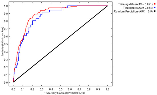 The evaluation of the initial MaxEnt model is presented in Figure 2, depicting the ROC curves. The corresponding AUC values for the training and test sets, representing the distribution area of Chinese apricot kernel cultivation based on potential environmental factors, are 0.891 and 0.864, respectively. These values indicate that the initial model achieved a prediction accuracy that meets the “good” standard. Therefore, the model can be utilized for the predicting the potential planting areas of apricot kernel.