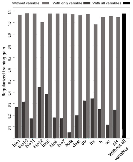 The contribution and replacement importance of each environmental factor to the model are presented in Table 2. Notably, BIO12, FRS, and H exhibited substantial contribution and replacement importance, surpassing 10%. Soil pH, BIO11, CLASS, BIO7, and OC ranked second, contributing over 2% to the model. The cumulative contribution rate of these aforementioned environmental factors reached 93.3% of the model. While the contribution percentage of BIO1 to the model was only 1.6%, its importance of substitution exceeded 10%. Conversely, BIO6, BULK, BIO5, BIO10, and DTR displayed contribution percentages and replacement importance below 2%, indicating a lesser reliance of the model on these five environmental factors. Consequently, these five factors were excluded from the subsequent suitability analysis to enhance the reliability of the results.