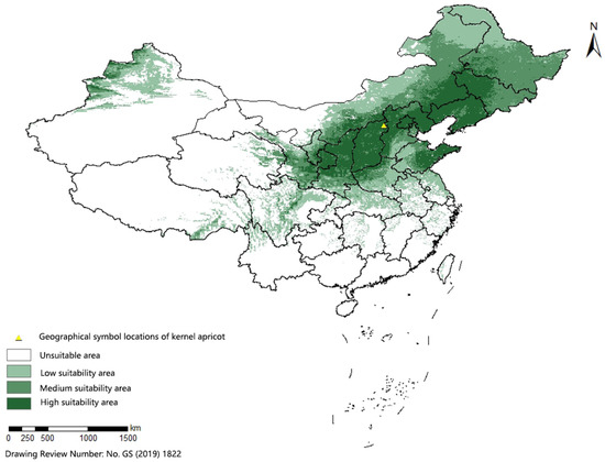 The study identified the five dominant environmental factors that significantly influence the planting suitability of apricot kernels, annual precipitation, frequency of frost days in April, altitude, soil pH, and available soil water content. These factors contributed to the model with percentages of 28.3%, 24.9%, 22.9%, 6.4%, and 2.4%, respectively. Using the Jenks Natural Breaks Classification in GIS, the suitability of apricot kernel planting was classified into four levels, high suitability, medium suitability, low suitability, and unsuitability. The thresholds for each suitability level were determined based on the ranges of the five environmental factors. The most suitable areas for planting apricot kernels were identified as having annual precipitation between 330.54 mm and 616.42 mm, frost days between 2.68 and 19.15 days in April, elevation between 84.22 m and 831.81 m, soil pH between 7.5 and 8.6, and available soil water content between 1.16 and 3.88. It should be noted that while most of the factors influencing the growth of apricot kernels were considered in this study, other factors such as human activities were not taken into account. Therefore, there may be slight biases in the experimental results, and further improvements can be made in future studies. The study revealed that apricot kernels have a widespread distribution in North China, Northeast China, eastern and northwestern Northwest China, northern Central China, and northern East China, with some presence in Southwest China. The high suitability areas were primarily concentrated in Hebei Province, Shanxi Province, Shaanxi Province, Liaoning Province, Jilin Province, Shandong Province, and Inner Mongolia Autonomous Region, and with sporadic distribution in the northeast of Xinjiang Uygur Autonomous Region. The medium-suitable areas were found in bands surrounding the high-suitability areas. These regionalization results align well with the concentrated distribution areas of apricot kernels and the geographical indication product areas of apricot kernels in China.