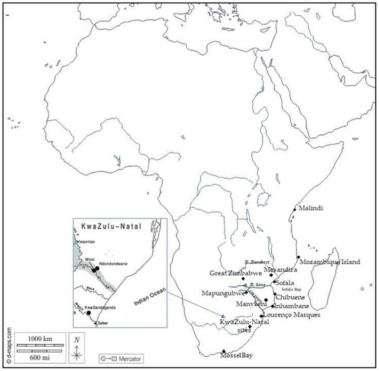 Southeast Africa—relative location of places mentioned in this text. Map created from an image available at https://d-maps.com/pays.php?num_pay=3&lang=en (accessed on 10 May 2013). Detail of the archeological sites of KwaZulu-Natal published by Bradfield [21].