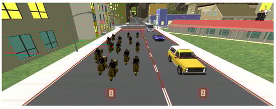 A third—and arguably more critical—issue with TG for DSs is the realistic simulation of traffic factors, including the traffic environments and behaviors of the virtual artificial objects (e.g., NPCPs and SDVs). Unlike the problems of converting the TS from 2D to 3D in the first paragraph, this part mentions the systems which are built for DS. These system’s outcomes, similar to our TG definition that leverage the capabilities of real-time game engines such as Unity3D and Unreal Engine have been able to more adequately satisfy the realistic physics for environments such as CARLA [20]. However, CARLA still applies the traditional waypoint [21] method to build pre-defined routes, similar to SUMO. Moreover, some research projects do not include intersections or ramps, in order to improve computational efforts [22,23]. On the other hand, the simulation of artificial vehicle and pedestrian behaviors in some studies is still characterized by limitations, such as performing car rotations around its center instead of steering the wheels when turning [24], while other solutions consider only single-lane traffic situations [10]. Furthermore, conflict prediction algorithms, such as that created by Liao et al. [18], are dependent on traffic situations such as changing lanes and ramps. This algorithm is valid only in the single-flow situation, where each lane contains a single vehicle (see lane number two depicted in Figure 1). If a lane is wide enough for more than one vehicle, the situation will be a dynamic flow (see lane number one depicted in Figure 1) or a mixed traffic flow (e.g., both cars and scooters running together in a small street with one lane). This traffic situation usually happens in Asian countries, such as Vietnam and China. Thus, this study contributes a different approach by separating the SDV functions into navigation and reaction modes.