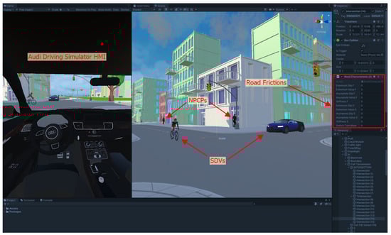 Secondly, the TG should improve the HCI for the driver in the DS, which involves the interactions between real drivers and SDVs and NPCPs. The system should simulate traffic based on related traffic theories, rules, and Unity physics, instead of pre-defined vehicle (game–object) transform logic. The default transform logic uses the force pushing the car body to move forward or rotate around its center when turning, and the wheels do not interact with the road surface. For these reasons, the two categories of simulation requirements to satisfy realism constraints are physics and behaviors (see Table 1).