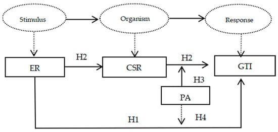 Conceptual Model. ER = environmental regulation, CSR = corporate social responsibility, GTI = green technology innovation, PA = public attention.