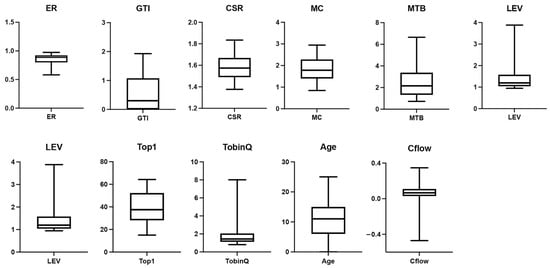 In addition to the above variables, other related enterprise-level data from the CSMAR Database were selected as control variables, which better correlates with China’s context [62,64,69]. They are market-to-book (MTB), financial leverage (LEV), return on assets (ROA), largest holder rate (Top1), TobinQ, enterprise age (Age), cash flow (Cflow), year, industry and province fixed effect.