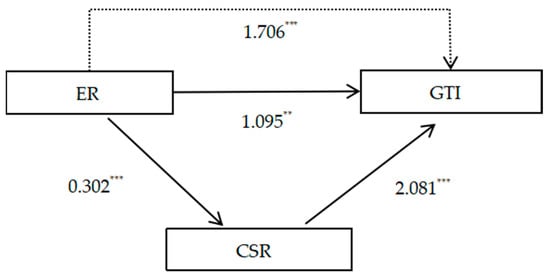 Stepwise regression analysis [70] was used to test Equations (2)–(4) aiming to find out the relationship among environmental regulation, CSR, and green technology innovation. In this process, this study focuses on the changes in direct effect that occurred after the addition of CSR and public attention (PA), respectively, and the regression results are shown in Table 4. First, Model (2) showed that environmental regulation has a positive impact on CSR, the coefficient is positive and statistically significant at 1% (0.302 ***). Second, Model (3) showed that CSR has a positive impact on green technology innovation, the coefficient is positive and statistically significant at 1% (2.081 ***). Third, Model (4) showed that the impact of environmental regulations on green technology innovation weakened after the addition of CSR. From Model (1), it can be seen that environmental regulation has a significant positive impact on green technology innovation with a coefficient of 1.706 and statistical significance at 1%, while after the addition of CSR, the effect of environmental regulation on green technology is weakened with a coefficient of 1.095 and statistical significance at 5%. This indicates that CSR plays a partial mediating role between environmental regulation and green technology innovation (1.095 ** < 1.706 ***); thus, H2 was verified. The detailed results of mediating effect process are demonstrated in Figure 3.