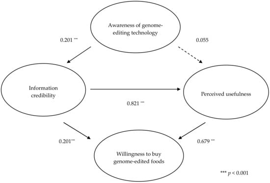 The path from perceived usefulness to willingness to purchase is also significant, indicating that promoting the usefulness of GE foods directly leads to a willingness to purchase. The findings were also true for new food services and new foods boosted by newly developed technologies. For example, perceived usefulness was found to be a major predictor of service adoption in drone delivery food services []. It is an important determinant of consumer intention to purchase traceable meat []. Consumers in Australia, Brazil, and Canada agree that GMO foods help solve environmental problems such as food security []. They show that the higher the level of agreement with the idea that GMO foods can help solve environmental problems such as food security, the higher the amount of willingness to consume the food.