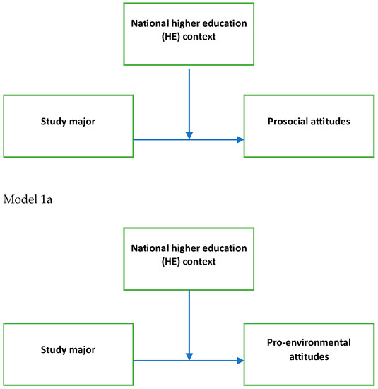Two resulting theoretical models imply a simple moderation, where study field is considered an independent variable, the resulting level of prosocial (i.e., pro-environmental) attitudes is considered a dependent variable, and the dichotomous variable indicating country of origin describes the overall moderating influence of the national higher education context (see Figure 1).