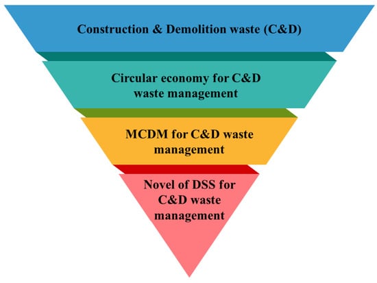 The conceptual “inverted pyramid” model of steps in the research is shown in Figure 1, and summarizes the overview of the Introduction to this study and addresses the problem of increasing amounts of construction and demolition waste around the world and their negative impact on the environment.