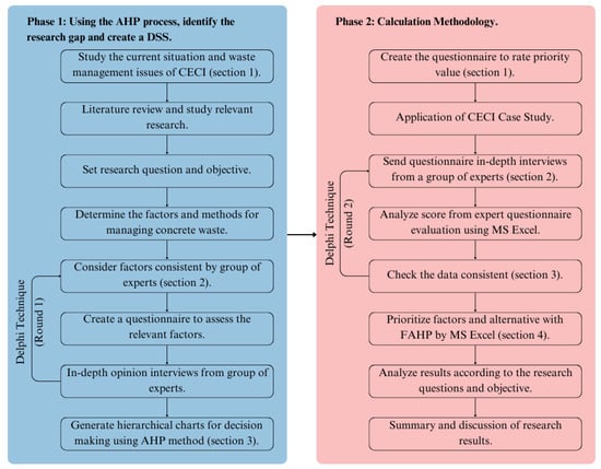 In Phase 1, Section 1, a theoretical study and a review of the relevant literature were conducted to investigate the current situation and issues related to concrete waste management in the circular economy of Thailand’s construction industry (CECI). The outcomes of this section led to research questions and objectives, and alternatives, criteria, and sub-criteria were collected from previous studies [67,68,69,70,71].