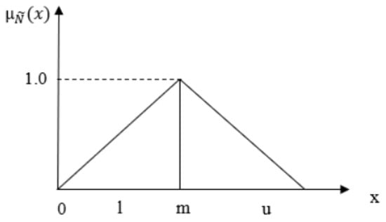 where l, m, and u are the lower, mean, and upper bounds, respectively, of the fuzzy number  N ~ . TFN can be denoted by  N ~  = (l, m, u). The operational laws of TFN  N ~  = (l1, m1, u1) and  N ~  = (l2, m2, u2) are provided by Equations (5)–(9) (Figure 5).