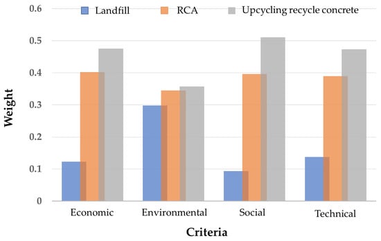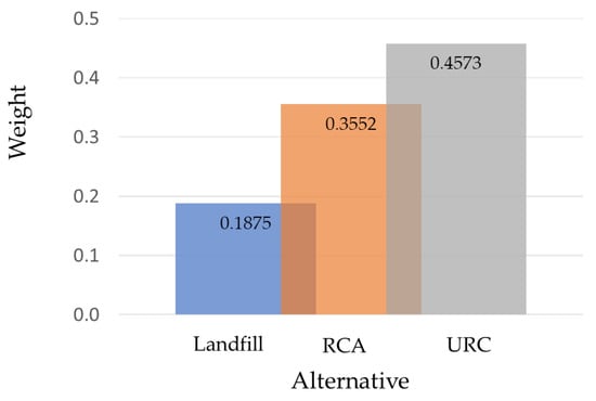In Phase 2, Section 4, after the consistency ratio (C.R.) was checked, evaluated, and scored based on the questionnaires of every expert (the resulting consistency ratio had to be less than 0.1 for the pairwise comparison to be considered reasonable and reliable), the main factors and sub-factors were prioritized to decide the most suitable method for concrete waste management. The calculation was performed by using MS Excel, and the analysis was conducting according to the fuzzy AHP method. The geometric mean method was used [73]. In the case of multiple experts in hierarchical analysis ranking an option differently, the geometric mean was used to add up or sum all the data from the experts before calculating the weights from the matrix of mean values [74].