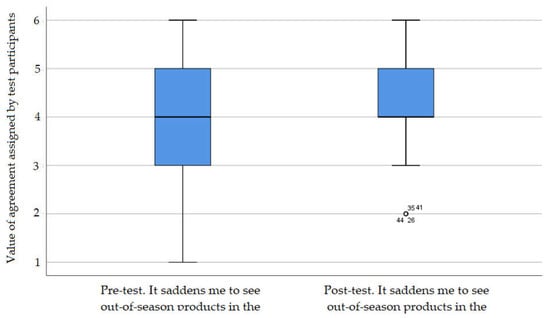 Results of the statement “I am sad to see out-of-season products in shops” in the pre- and post-test phases.