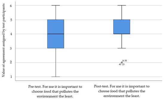 The PSTs have shown their opinion on whether it is important for them to consume food that is less contaminated in its production, preservation, and marketing process (Table 3). From their answers in the pre-test phase, a majority slightly agree or agree. Specifically, a mean of 3.9, a median of 4, and a standard deviation with a value of 1.358 were obtained. In contrast, in the post-test phase, a greater environmental awareness was shown, as most of the responses were in the agree or quite agree range (Figure 2). In this second measurement, the median rises to 4.29, the median remains at 4, and the standard deviation takes a value of 1.19.