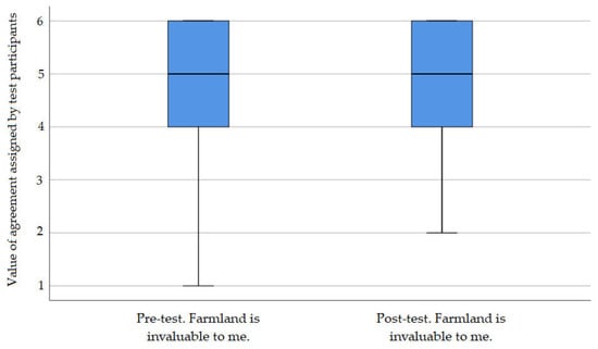The PSTs have given their opinion on the importance of farmland for them (Table 5). The most frequent responses in the pre-test phase are “agree” and “totally agree”. The mean obtained in this phase is 4.59, the median 5, and the standard deviation 1.258, i.e., the PSTs attach a certain value to farmland. However, in the post-test phase, the degree of agreement with the statement increases, with the most frequent responses being “totally agree” and “quite agree”. In this case, the mean rises to 5.04, the median remains at 5, and the standard deviation is 1.117 (Figure 4).