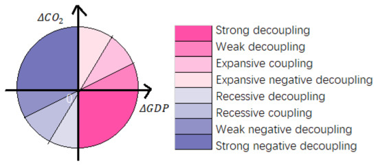 To better study the relationship between economic development and environmental pollution, the Organisation for Economic Cooperation and Development (OECD) put forward the decoupling index. Based on this index, Tapio [33] constructed a decoupling model for analysing traffic carbon emissions that divided the decoupling state between carbon emissions and economic development level into eight types (Figure 2).