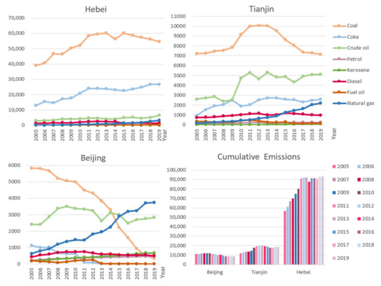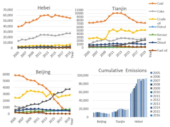 From 2005 to 2019, total B–T–H carbon emissions increased by 1.5 times, with Hebei’s carbon emissions, which grew rapidly and then remained relatively stable over the study period, accounting for the largest share of the total (74.9%). Tianjin and Beijing’s emissions (15.6% and 9.5%, respectively) followed, both proceeding from slow growth to steady decline during the study period. Coal dominated carbon emissions in Hebei (64.6%) with a trend of rapid increase to general stability to a slow decline, supplemented by coke (25.9%). Tianjin’s emissions were also dominated by coal (48.6%), which rose then fell with a sharp rate of decline. Crude oil was the second source (13.0%). Natural gas carbon emissions increased by 74 times but remained a relatively minor source. Beijing’s coal carbon emissions fell by 94%. Crude oil emissions increased first, and then decreased, and natural gas carbon emissions became Beijing’s largest source of carbon emissions after 2016.