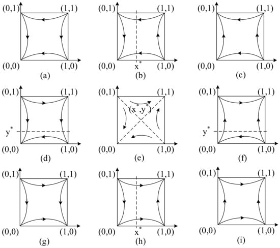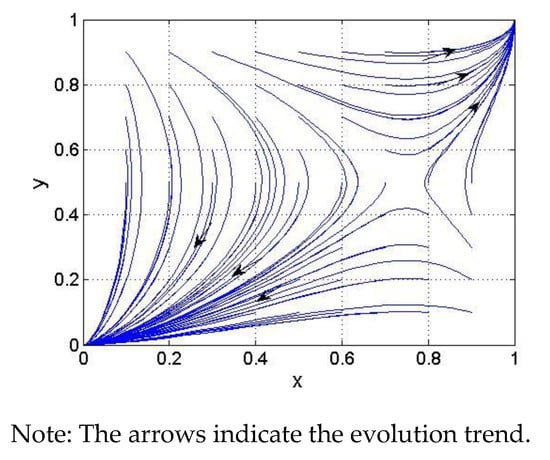 From Equations (7) and (8), set F(x) = 0, and F(y) = 0. (0,0), (0,1), (1,0), and (1,1) can be obtained as equilibrium points. When and hold, the formula F(x*) = 0 and F(y*) = 0 can be obtained, at the same time 0 < x* < 1, and 0 < y* < 1, in which , , so (x*,y*) is also an equilibrium point.