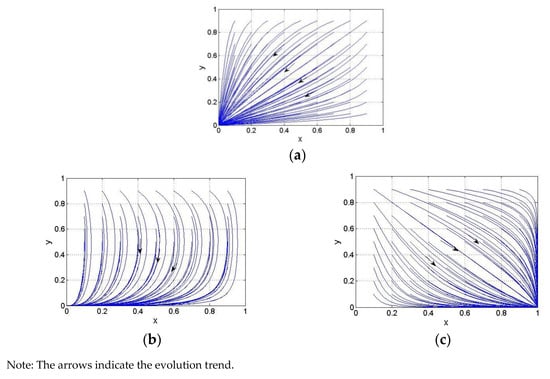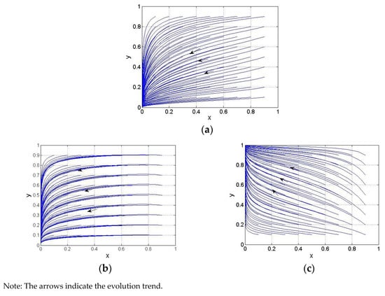 By calculating the determinant and trace of the Jacobian matrix, the above equilibrium points can be judged. If and , the equilibrium point is ESS. If and , the equilibrium point is unstable. Or else, the equilibrium point is the saddle point [].