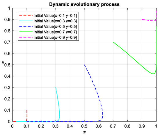 This paper further demonstrates the evolutionary trajectory of the above equilibrium points and the evolution of different initial value points for the game subjects to the equilibrium point. It analyzes the evolutionary trajectory of different ratios for traditional energy clean use and renewable, clean energy use, as well as the changes in the revenue and subsidy-related parameters regarding the local government’s decision to provide a subsidy or not and the energy companies’ comprehensive use of energy or not, by using numerical simulations. In order to meet the actual energy utilization of energy companies in the Yellow River Basin, the following parameters are set in conjunction with the references [43,45,46] and the previous constraints: , the unit of these parameters is CNY 100 million. A and b represent proportions, and these two parameters are pure numbers without units.