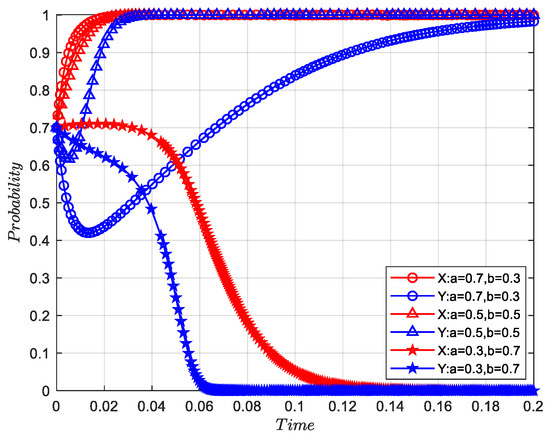 The energy utilization proportions of the numerical simulation are taken as . As can be seen from Figure 3, the change in the ratio of clean use of traditional energy to renewable, clean energy use has a significant effect on the stabilization trend of the system evolution: when the clean utilization of traditional energy accounts for a higher proportion of the integrated energy utilization, the strategy stability point of the game participant subject is (1,1). When renewable clean energy utilization accounts for a higher proportion of the integrated energy utilization, the strategy stability point of the game participant subject is (0,0). The ratio of clean use of traditional energy and clean, renewable energy use depends on the expected benefits from these two types of energy use and the government subsidies for both types of energy use. When the proportion of clean use of traditional energy is high, energy companies actively adopt advanced technologies to optimize the use of traditional energy in the context of the “double carbon” target, driven by local government subsidies and resource endowment in the Yellow River Basin, and the final strategy of local governments and energy companies tends to {provide subsidies to use integrated energy}. Similarly, as the share of renewable clean energy use in integrated energy use increases, the expected revenue from renewable, clean energy utilization also increases. However, due to the unstable and discontinuous nature of renewable, clean energy, the increase in subsidies is not accompanied by an equal increase in expected revenue, and the final strategy of local governments and energy companies in the Yellow River Basin tends to be {no subsidies, use traditional energy}. This implies a more reasonable proportional structure for the clean use of traditional energy and renewable, clean energy use in the integrated energy use structure in order to drive the strategic choices of the game players {providing subsidies to use integrated energy}. Meanwhile, to match the actual energy use in the Yellow River basin, a combination of a = 0.7 and b = 0.3 energy use proportions is chosen in the subsequent simulation analysis.