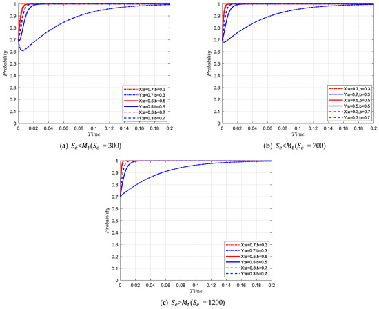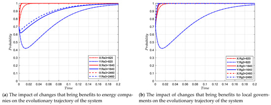 Setting and to 820, 1640, and 2460, respectively, representing the increasing benefits to both participating parties as the energy system’s resilience increases, it can be obtained from Figure 4 that as the benefits from energy system resilience increase, the time that energy companies choose to reach stability using integrated energy strategies becomes progressively shorter. The earnings from the energy system’s resilience arises from enhancing the capacity to utilize both traditional and renewable, clean energy sources. Local government subsidy policies drive energy companies to pursue integrated energy use actively. However, government subsidies for renewable, clean energy use outweigh the benefits they receive in terms of energy system resilience improvement when renewable, clean energy use capacity is weak. Overall, integrated energy use involving traditional clean energy use capacity is strong, and the renewable, clean energy use capacity is weak. Due to the large subsidy gap in renewable, clean energy use, some energy companies have insufficient incentives for renewable, clean energy utilization, driving a gradual decline in the overall willingness of local governments to subsidize it, which in turn leads to a restriction on the ability to utilize renewable, clean energy. With the improvement of renewable, clean energy utilization capacity, the subsidies provided by local governments for renewable, clean energy utilization are smaller than the benefits brought to them by the improvement of energy system resilience, and the willingness of local governments to subsidize renewable, clean energy is gradually increased. The final game subject strategy is stabilized at (1,1). As energy system resilience brings increasing benefits to energy companies, the magnitude of local government subsidies that first fall and then rise gradually decreases. As seen in Figure 4a, energy companies’ gains in increasing energy system resilience are not directly fed back to local governments, so even if energy companies’ renewable, clean energy utilization capacity increases, it will not change the overall trend of the subsidy strategy.