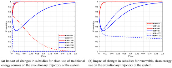 The was set to 43, 86, and 172 to represent the changes in low, medium, and high subsidies, as shown in Figure 5b. Local government subsidies for renewable, clean energy use depend on the share of renewable, clean energy in the integrated energy use and the revenue that renewable, clean energy use generates for local governments. Due to the instability and uncontrollability of renewable, clean energy use, local governments provide fewer subsidies for renewable, clean energy use when weighing the benefits and inputs. With the further implementation of renewable, clean energy utilization policies, the capacity of energy companies to utilize renewable and clean energy is enhanced, and the gap between the subsidies provided by local governments and the income from renewable energy utilization is narrowing, and subsidies from local governments are increasing. As renewable, clean energy technologies continue to mature and the ensuing revenues gradually cover government subsidies, local governments are providing tighter subsidies for renewable, clean energy use, a move that effectively promotes competition in the renewable energy market. In combination with (a) and (b), a range of subsidies needs to be set for clean traditional energy use and on-demand subsidies for renewable, clean energy use to induce the game players to reach an evolutionary equilibrium state of {no subsidies, integrated energy use.