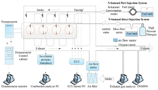In this study, the experiments were performed on a four-cylinder four-stroke water-cooled combined injection SI engine, a dual injection engine with port and direct injection. The main technical parameters of the original engine are listed in Table 2. Since the original direct injection system was designed for gasoline fuel, the fuel injected in the cylinder directly in this paper is butanol. Therefore, the high-pressure oil pump with direct injection in the original cylinder was not used in this test, but the high-pressure nitrogen cylinder pressurized method was used, and the direct injection pressure was 5 MPa. The original engine’s oil pump still supplies the low-pressure port injection with an injection pressure of 0.3 MPa. The dual injection systems of the engine included partial n-butanol direct injection and partial n-butanol port injection. The experiment system structure image of the test engine is shown in Figure 1. Figure 1 shows that engine control parameters such as injection timing and injection durations for n-butanol and the throttle opening were all accurately controlled by the electronic control unit (ECU). The direct injection ratio is controlled precisely by adjusting the injection pulse width of the injector in real time.