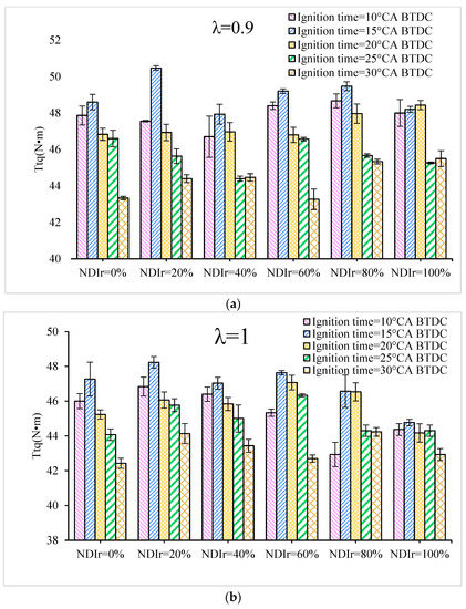 Figure 2 shows Ttq with ignition time at different NDIr and λ. The error bar indicates standard deviations for each experimental data. The value of λ is set to 0.9, 1, and 1.2, which, respectively, represent the three conditions of rich burn, stoichiometry, and lean born. It can be seen that Ttq increases first and then decreases with the advance of ignition time at different NDIr and λ. This can be explained by the following reasons. With the increase in the ignition advance angle, more fuel burns before the TDC leads to a rise in the compression negative work. When the ignition time is too late, post-combustion occurs, resulting in a decrease in torque. We also can see that the torque of N20DI is nearly the highest among different NDIr. The specific reasons will be analyzed in detail in the next section. In addition, Figure 2a–c show that under different λ, the maximum torque corresponding to the ignition time is different. When the values of λ are 0.9 and 1, the MBT is 15 °CA BTDC. While MBT is 20 °CA BTDC at λ = 1.2. This is mainly caused by the slow combustion speed under lean burn conditions. The slow combustion speed makes the whole combustion duration long, and the ignition time needs to be advanced to obtain the appropriate combustion phase.