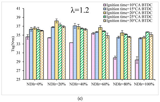 Ttq with ignition time at different NDIr under λ = 0.9, 1, 1.2. (a) λ = 0.9; (b) λ = 1; (c) λ = 1.2.