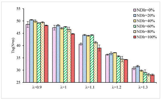 Figure 3 displays the Ttq with NDIr at different values of λ. It can be seen that Ttq rises first and then drops with the increase in NDIr, reaching the maximum value at NDIr = 20%. The Ttq values of N20DI increase by about 3.3%, 0.4%, 9.1%, 4.1%, and 2.6% for λ values of 0.9, 1.0, 1.1, and 1.2, respectively. This can be attributed to the following reasons. On the one hand, when n-butanol is directly injected into the cylinder, it will cause a localized over-dense layered mixture near the spark plug, promote combustion in the cylinder and increase Ttq [32]. On the other hand, the n-butanol injected directly into the cylinder evaporates and absorbs heat, causing a drop in the temperature of the cylinder. Additionally, with the increase of NDIr, the local rich-fuel region increases, resulting in the formation of an inhomogeneous mixture and, finally, mass-spread combustion [21]. When NDIr is lower (20%), all these beneficial factors predominate and encourage the Ttq to rise. Therefore, Ttq rises first and then drops as NDIr increases. Moreover, compared with the NDI, the NPI injection mode allows more time to obtain a better air-fuel mix, resulting in a more complete combustion of the in-cylinder mixture and a higher Ttq. In addition, Ttq decreases gradually with the increase in λ, which could be attributed to the rise in λ making the mixture of n-butanol and air lean so that cycle fuel feeding decreases, resulting in the decrease in Ttq.