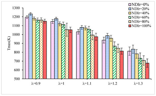 From Figure 5, it can see that Tmax with NDIr at different λ. It can be seen that the Tmax shows a slight increase and then a gradual decrease with the increasing DIr, reaching the maximum value at NDIr = 20%. The results may be explained in two ways. Firstly, a dual injection could effectively combine the benefit of NDI and NPI, a small amount of n-butanol is injected directly into the cylinder, causing a localized concentration of the layered mixture near the spark plug, which promotes the combustion in the cylinder and leads to an increase in Tmax [13]. On the other hand, it can be attributed to is the properties of butanol itself. Because of the higher latent heat of vaporization, the n-butanol injected directly into the cylinder evaporates and absorbs heat, resulting in a decrease in Tmax [30]. The latter predominates when NDIr exceeds 20%, so the Tmax increases first and then decreases as the NDIr increases.