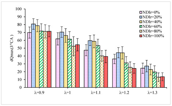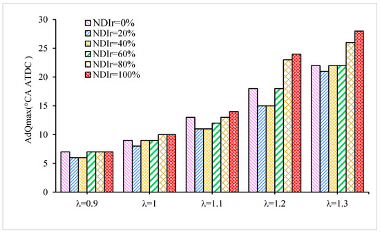 Figure 6 and Figure 7 show the maximum heat release rate (dQmax) and the dQmax (AdQmax) position with NDIr under different λ. It is shown that the dQmax has the same tendency as the Tmax. Additionally, the AdQmax decreases initially and then increases. It is clear that dual injection with 20% and 40% NDIr results in a higher dQmax. Meanwhile, the peak phase moves forward correspondingly, which enables combustion to release more energy around the TDC. This is mainly because the locally stratified mixture formed near the spark plug due to the small amount of n-butanol injected directly into the cylinder can ensure the ignition’s reliability, creating a more stable flame core and promoting the early propagation of flame, thus promoting the exothermic process of the mixture.