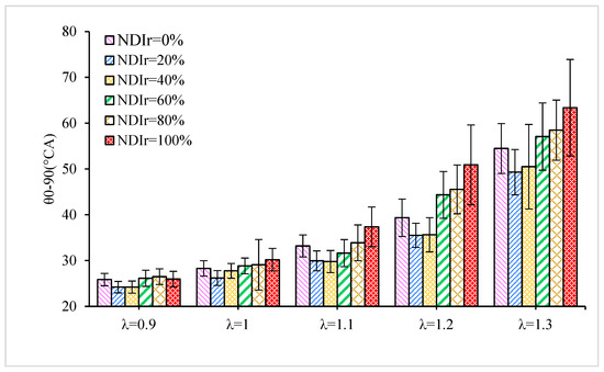 In this paper, the θ0-90 is defined as the crank angles for which 0–90% of the fuel mass has been burned. Figure 8 shows that the θ0-90 decreases first and then increases as NDIr increases. Figure 8 shows that compared to the single injection mode, the dual injection mode with NDIr values of 20% and 40% has obvious advantages in terms of θ0-90, especially under the larger λ. Compared to the results obtained with NPI and NDI, at λ = 0.9, 1, 1.1, 1.2, 1.3, the θ0-90 of N20DI decreases by 2 °CA, 2 °CA, 3 °CA, 4 °CA, 5 °CA, and, 2 °CA, 4 °CA, 7 °CA, 15 °CA, and 14 °CA, respectively. Combined with the previous analysis, dual injection mode with a relatively small NDIr can form a good layered mixture, which is beneficial to the ignition and the formation of a stable flame nucleus in the initial stage. Therefore, the smaller NDIr greatly increases the combustion speed. In addition, when the NDIr is constant, θ0-90 extends with the increase in λ. The increase in λ means the mixture gets leaner and the fuel burning rate slower, thus extending θ0-90.