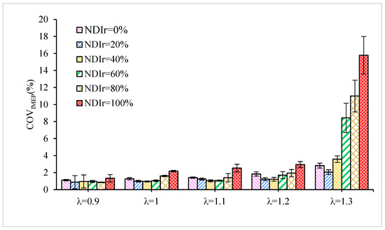 Figure 9 shows the mean indicated pressure (IMEP) COV with NDIr under different λ. As seen from Figure 9, with the increase in NDIr, COV decreases first and then increases with NDIr, reaching a maximum at N20DI. It is interesting that COV changes significantly with DIr as λ increases. As can be seen in Figure 9, when λ is 1.2, compared with NPI and NDI, the COV of N20DI decreased by 30% and 60%, respectively. When λ is 1.3, compared with NPI and NDI, the COV of N20DI decreased by 30% and 90%, respectively. When λ is less than 1.2, the NDIr has little effect on COV under dual injection mode. However, comparing to NDI, the dual injection mode significantly improves engine stability. The reason for the above phenomenon is that the early stage of flame development is the main factor that causes the engine cyclic variation [33]. A small amount of butanol is directly injected into the cylinder, and the mixture is enriched near the spark plug to form stratified gas, which makes the ignition process more stable. In addition, it improves the flame propagation speed, reduces the influence of uncertain factors such as local misfires, and makes the engine run more smoothly. When the NDIr is relatively large, it can be seen from the previous analysis that the heterogeneity of the mixture and the fuel characteristics of butanol itself lead to the deterioration of combustion, leading to the increase in COV. The results show that the dual injection mode with NDIr of 20–40% can effectively reduce COV compared to NPI and NDI, especially under lean burn mode.