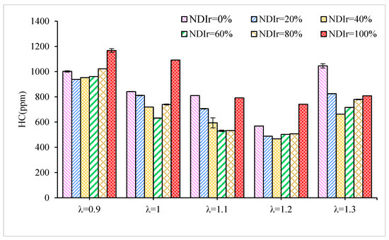Figure 11 shows the CO emissions with NDIr at λ values of 0.9, 1, 1.1, 1.2 1.3. Figure 11 shows that when λ is more than 0.9, CO emissions remain low and are little affected by NDIr. This may be explained by the fact that the n-butanol fuel itself contains oxygen and burns under the condition of sufficient oxygen, and the oxidation efficiency of CO is very high, so CO emissions are not affected by NDIr much. When λ is 0.9, the CO emissions are much higher than those obtained at the other four conditions. This is because when λ = 0.9, the mixture in the cylinder is rich, and the oxygen content is insufficient, leading to incomplete fuel combustion and higher CO emissions. The results indicated that compared with the in-cylinder direct injection, the dual injection mode of n-butanol can significantly reduce CO emission for the rich mixture.