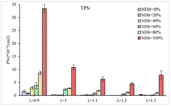 Figure 15 is a sum of Figure 13 and Figure 14. The sum of NPN and APN for NDIr and different λ can be seen. The TPN shows similar trends as NPT, with an increase for increasing NDIr, and decreases initially and then increases slightly with the increasing λ. This is because APN is very low, almost negligible compared with NPN; the behavior of TNP can be explained in terms of the behavior of NPN.