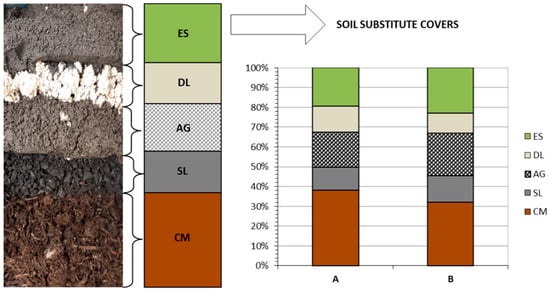 List of wastes and their percentage range (% m/m) for soil substitute covers: ES—energetic slag; DL—decarbonisation lime; AG—aggregate; SL—sealing material; CM—spent mushroom compost.