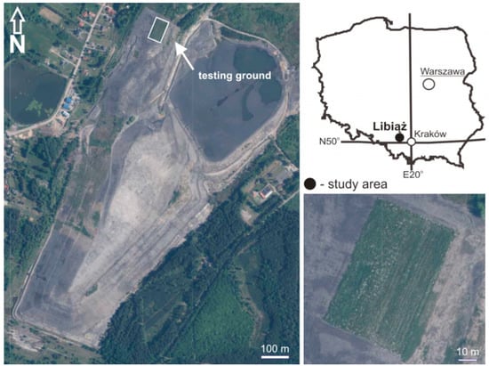 The testing ground (4000 m2) was located on the Janina Mine spoil heap, property of Tauron Wydobycie S.A (Figure 2), which is the post-exploitation heap located in the town of Libiąż (50°05′03.5″ N, 19.18′18.7″ E). It covers an area of about 80 hectares (partly reclaimed) and reaches 35 m in height, and is one of the biggest mining spoil heaps of this kind located in the Silesia region in Poland. The annual coal production by the Janina Mine is in the range of 1000–1400 thousand tonnes. The waste heap contains waste rock, a mixture of clay shales, siltstones and sandstones with crubs of coal. Slope heaps are exposed to strong erosion caused by rainwater and snowmelt runoff. It is also a good “field laboratory” for assessing land rehabilitation techniques due to the highly acidic character of the wastes.