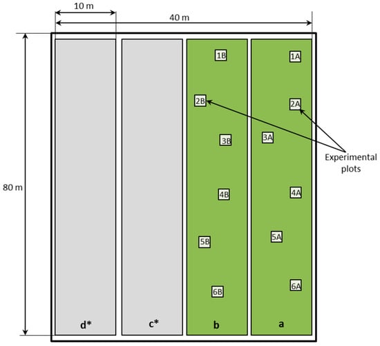 Design of the testing ground and experimental plots in the study area: a—dry meadow habitats, b—mesic meadow habitats, c—shrubs, d—wetland habitats, * further research.