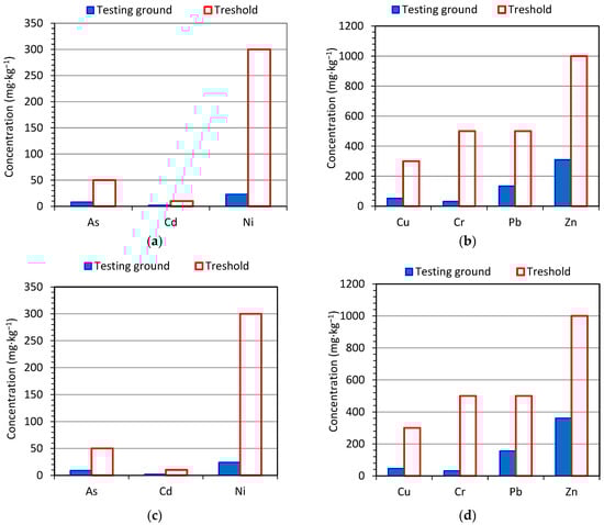The concentration of trace elements in soil covers and their limited thresholds areas according to Polish Regulation [30]: (a) As, Cd, Cr, Ni in soil cover A; (b) Cu, Mn, Pb, Zn in soil cover A; (c) As, Cd, Cr, Ni in soil cover B; (d) Cu, Mn, Pb, Zn in soil cover B.