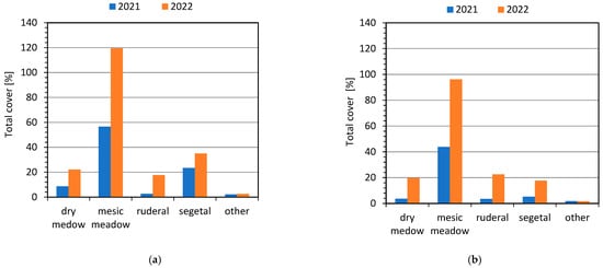 The highest average cover of the species in 2022 was observed for mesic habitat vegetation, i.e., 120% for soil A and 96% for soil B. This vegetation had the highest average coverage increase between 2021 and 2022. The average coverage of species typical of dry habitat vegetation was comparable on soil A (9% in 2021 and 22% in 2022) in comparison to soil B (4% in 2021 and 20% in 2022). The cover of species characteristic of ruderal vegetation changed from 2 to 23% (soil A) and from 3 to 12% (soil B), whereas for segetal vegetation, the coverage changed from 27 to 35% (soil A) and from 5 to 18% (soil B). These species can spread mainly by wind over long distances and fast-cover open areas. The other species of vegetation on soils A and B were below 3%, respectively. The proportion of each of the vegetation communities identified in the first and second year on dry and mesic habitats is shown in Figure 6.