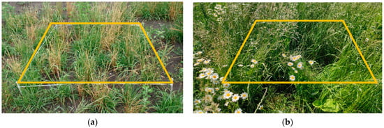 The testing ground was geodetically divided into four sections (10 × 80 m) to sow dry and mesic meadow habitats and other plants (shrubs and wetland habitats) for a further research study (Figure 4). The soil cover thickness on the ground surface was about 0.3 m. The experimental plots were set in the sections with meadow vegetation as follows: 6 plots in the dry meadow section (numbered from 1A to 6A), and 6 plots in the mesic meadow section (1B–6B). Detailed lists of the vascular plant species in the 1 m2 experimental subplots were made in June 2021 and June 2022. The percentage cover of each plant species was evaluated using the following scale: 1%, 5%, 10%, 20%… 100%. The observed plant species, due to their preference to occur in specific habitats, were classified into the following plant community types: dry meadow (Cl. Agropyretea intermedio –repentis, Cl. Festuco-Brometea, Cl. Koelerio glaucae-Corynephoretea canescentis), mesic meadow (Cl. Molinio-Arrhenatheretea), segatal vegetation (Cl. Polygono-Chenopodietalia, Cl. Stellarietea mediae) and ruderal vegetation (Cl. Molinio-Arrhenatheretea) [26]. The abundance of species classified to particular habitats defines the degree of similarity that the vegetation developed on the experimental plots to semi-natural and anthropogenic plant communities distinguished for the whole-country scale (Poland).