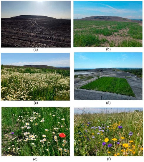 Development of meadow vegetation using soil covers at Janina Mine waste heap: (a) land area before the experiment; (b) testing ground after 7 months of reclamation; (c) testing ground after 18 months of reclamation; (d) testing ground in 2022 after planting and seeding; (e) mesic meadow vegetation; (f) dry meadow vegetation.