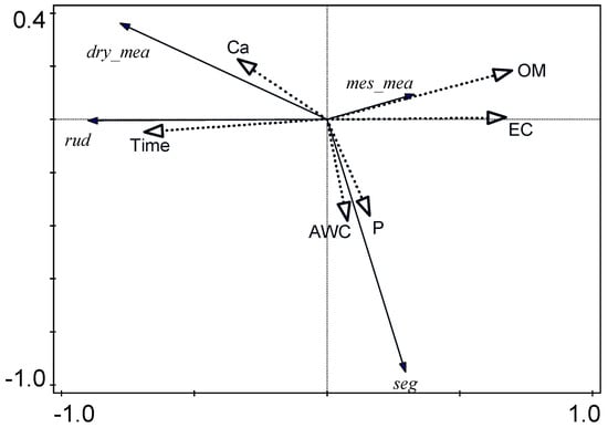 Based on field results, PCA analysis was used to assess the influence of environmental factors on vegetation development (Table 5). The first ordinal axis of the PCA model (axis 1) accounts for 54.39% of the total variability of the vegetation developed in the field. This axis shows a negative correlation between vegetation development time (TIME, −0.69) and Ca soil content (−0.34), and a positive correlation with organic matter soil content (OM, 0.7) and soil salinity (EC, 0.67). The cover of ruderal vegetation and dry meadow species shows a strong negative correlation with that axis. The second axis (axis 2) explains 25.85% of the response variables’ variation and shows the gradient in soil phosphorus content (Pt) and the amount of soil water available for plants. Segetal species cover shows a strong correlation with that axis (−0.95). Mesic meadow species cover has the strongest correlation (0.32) with the first ordination axis.