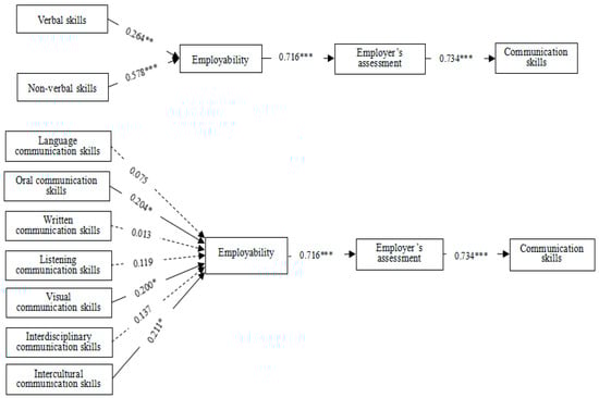 With the advent of the digital age and Industry 4.0, the communication skills of engineering students has been exerting gradually increasing influence on the need for enhanced student employability. To address this issue, this study evaluates the influence of communication skills on the employability of engineering students from the aspects of verbal and non-verbal skills through the four key elements of Outcome-Based Education (OBE) theory. A total of 130 college engineering students and practitioners participated in the questionnaire survey, and the hypotheses were tested by regression analysis and a structural equation model (SEM). The results show that in the digital age, the verbal (p < 0.01) and non-verbal (p < 0.001) components of students’ communication skills play a significant role in the employability of engineering students. Meanwhile, the employer’s assessment simultaneously makes a significant contribution to the further improvement of students’ communication skills, which can help educators further cultivate and improve students’ communication skills through the assessment of their employability by employers. Therefore, this research has theoretical and practical significance, which not only enriches the basic theoretical knowledge, but also broadens the training methods of engineering students in the digital age, thus enhancing their employability.