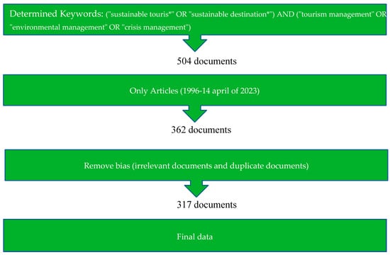We analyzed studies specifically related to the management of sustainable tourism. In order to correctly establish the search parameters, we took into account those bibliometric studies related to sustainable tourism [2,3,18,19,20,21,53] and the keywords of articles with a high number of citations in this field [5,27,54,55,56,57,58,59,60,61,62], as in the work of [36,63]. Given that the objective of the study was to analyze sustainable tourism in the field of environmental management, the keywords in the row section were as follows: the first group combined the words ‘sustainable touris*’ OR ‘sustainable destination*’ and the second group combined the words ‘tourism management’ OR ‘environmental management’ OR ‘crisis management’. In order to limit the number of documents, we limited the search parameters in terms of topic, that is, the words could only be found in the title, abstract or keywords [47]. We filtered the 504 resulting documents according to the following norms to guarantee that all the sample articles were congruent with the objectives of our study (Figure 1), following the indications in [63]. In this way, at first, only articles were included, excluding, e.g., proceeding papers, book chapters, review articles, editorial material, meeting abstracts and books during the period between 1996 and 14 April 2023. The data were obtained from the Web of Science Core Collection database, which is widely used in bibliometric analysis due to its high impact factor and is widely regarded as the most reputable index available. [47]. With more than 14,000 journals, it is considered the database with the highest quality [45]. This database can filter to ensure that only articles are searched, which are considered most relevant for the investigation [63]. Second, we carefully reviewed all the articles and eliminated those studies unrelated to the subject being analyzed. Finally, using Excel and Endnote, we looked for duplicate records and did not find any. Ultimately, through applying these filters, we obtained a sample of 317 articles (Figure 1).