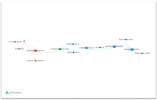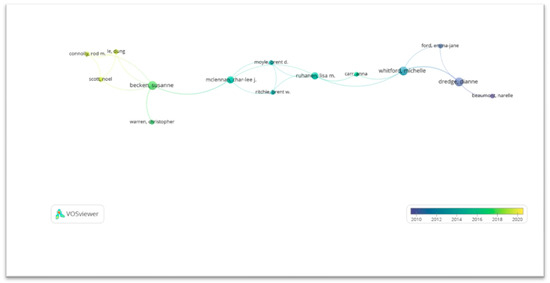 Co-authorship analysis shows the collaboration networks that exist between authors, organizations or countries promoting the development of knowledge in a given scientific field [69,70]. It was introduced in 1966 by De Solla and Beaver [71] in the field of psychology. In scientific fields seeing increased methodological and theoretical complexity, this type of analysis is useful for understanding how different authors, organizations or countries collaborate with each other [31,69]. Following the recommendations of Koseoglu et al. [72], in our analysis we used the co-authorship of the authors, because whereas authors remain stable over time, their affiliations with countries or universities may change. We established a cut-off point of 20 citations per author, which gave rise to 14 authors distributed in three collaboration networks. Our analysis of scientific production networks allowed us to identify three clear collaboration networks: two of them of an international nature and all of them are international and inter-institutional in nature (Figure 3). In Figure 4, we observe the trend of co-authorship during the analyzed period. We observe how the blue network is the oldest, starting in 2010, followed by the green network, with the red network being the one with the most recent publications, reaching 2020. The number of publications is homogeneous throughout the analyzed period. The red network is made up of Scott, Noel from the University of the Sunshine Coast (Australia); Le, Dung of VinUni University (Vietnam) and Connolly, Rod, Becken, Susanne and Warren, Christopher from Griffith University (Australia). This network is the most current, is international and inter-institutional in nature, and began production in 2017, ending in 2019. The green network is made up of McLennan, CharLee J. from Griffith University (Australia); Ritchie, Brent W and Ruhanen, Lisa M. of the University of Queensland (Australia), Moyle, Brent from Southern Cross University (Australia) and Carr, Ana from the University of Otago (New Zealand). This network is international and inter-institutional in nature and began production in 2014, ending in 2016. The blue network is made up of Dredge, Dianne and Beaumont, Narelle from the University of Queensland (Australia) and Whitford, Michelle and Ford, Emma-Jane from Southern Cross University (Australia). This network is inter-institutional in nature, is the oldest (being in force between 2010 and 2011) and is made up of the two most productive authors in terms of number of citations (Table 3).