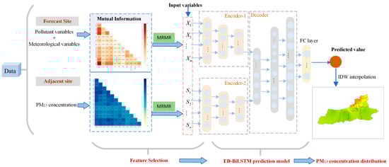 We propose a new three-stage combination model for use in short-term PM2.5 prediction. In the first part of the research, we select the temporal and spatial features related to PM2.5 concentration through the MRMR algorithm. For the second part, we construct a dual encoder–decoder model based on BiLSTM to train and learn the spatiotemporal features and perform prediction. Finally, the study area is divided into 1 km × 1 km grids, and the IDW method is used to interpolate the grids to obtain PM2.5 concentration values of all grids. Figure 1 presents a flow chart for the proposed model. This section describes the methods involved in the model in detail.